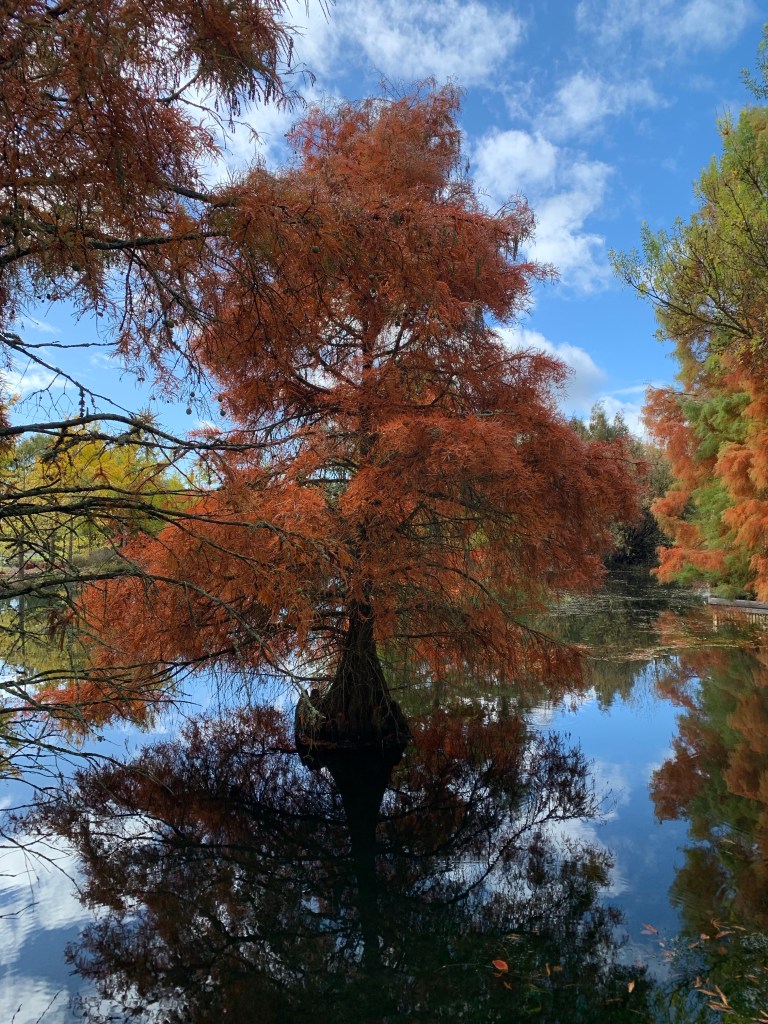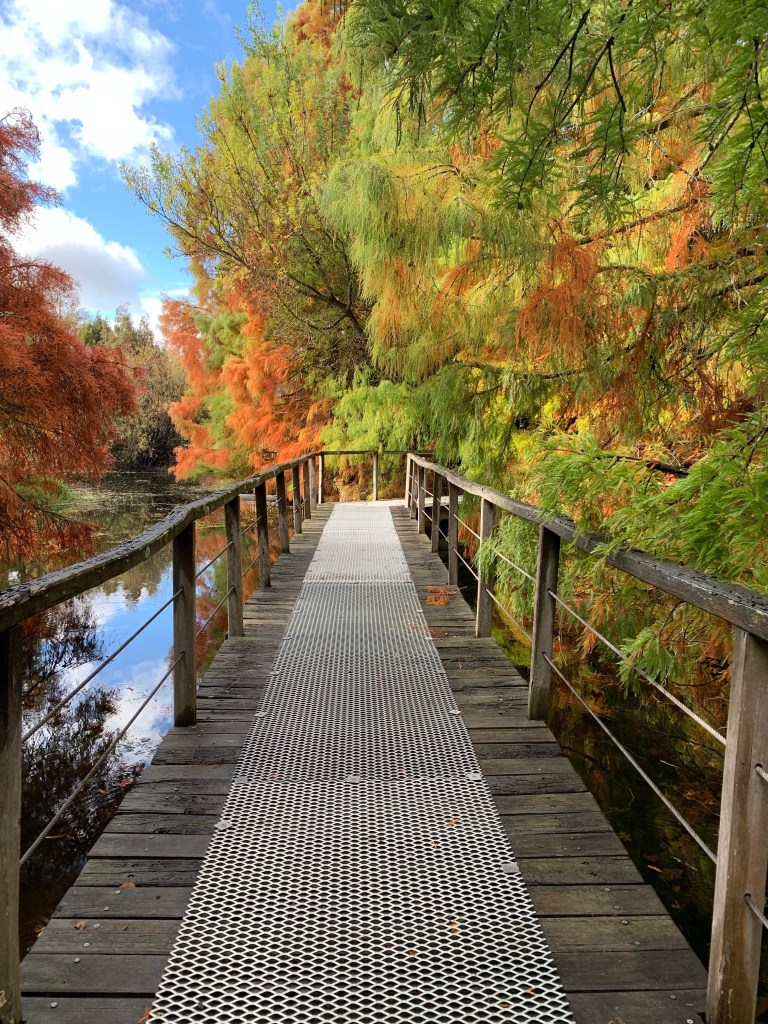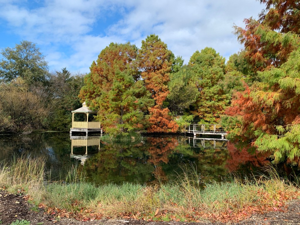 In its current format the gardens are divided into two sections, an older section with some beautiful, well established exotic trees, and an Australian native section with some eucalypts of seeming similar age as the exotic trees and newer plantings of native grasses and rushes. There are some beautiful specimens of coniferous trees and deciduous trees that were resplendent in their autumn finery.