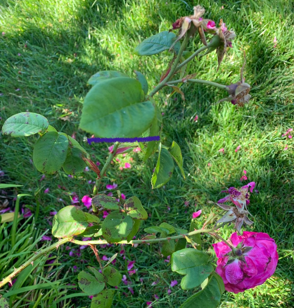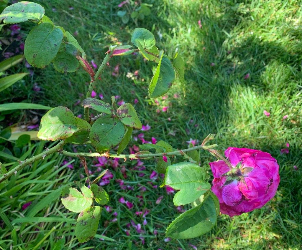 Roses bushes are often putting on another growth spurt at this stage, so there will often be a new stem forming further back down the stem you are going to cut, behind the dead or dying flower. You can either cut back to these new growths when cutting off the dead flowers (otherwise known as ‘deadheading‘) or, depending on what shape you want to leave the plant in, you can cut back to a set of leaves further up the stem.