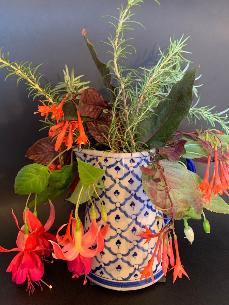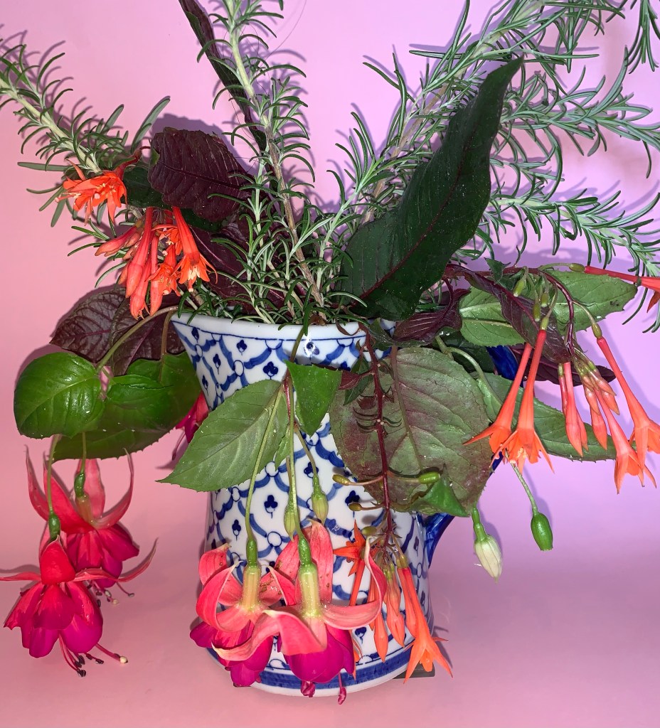 Most flowers are easy to place into an attractive arrangement, but one species I always have difficulty with are the Fuchsias. They tend to ‘dangle’ a little too much for my liking, but I’m always up for a challenge… within reason. I’ve included in this ‘glog’ (gardener’s log) a few of the results of this morning’s experiment. I’m also experimenting with backdrops and lighting. Flash? Or no flash? Overhead lighting or side lighting? Both? I may have to invest in something more technical.